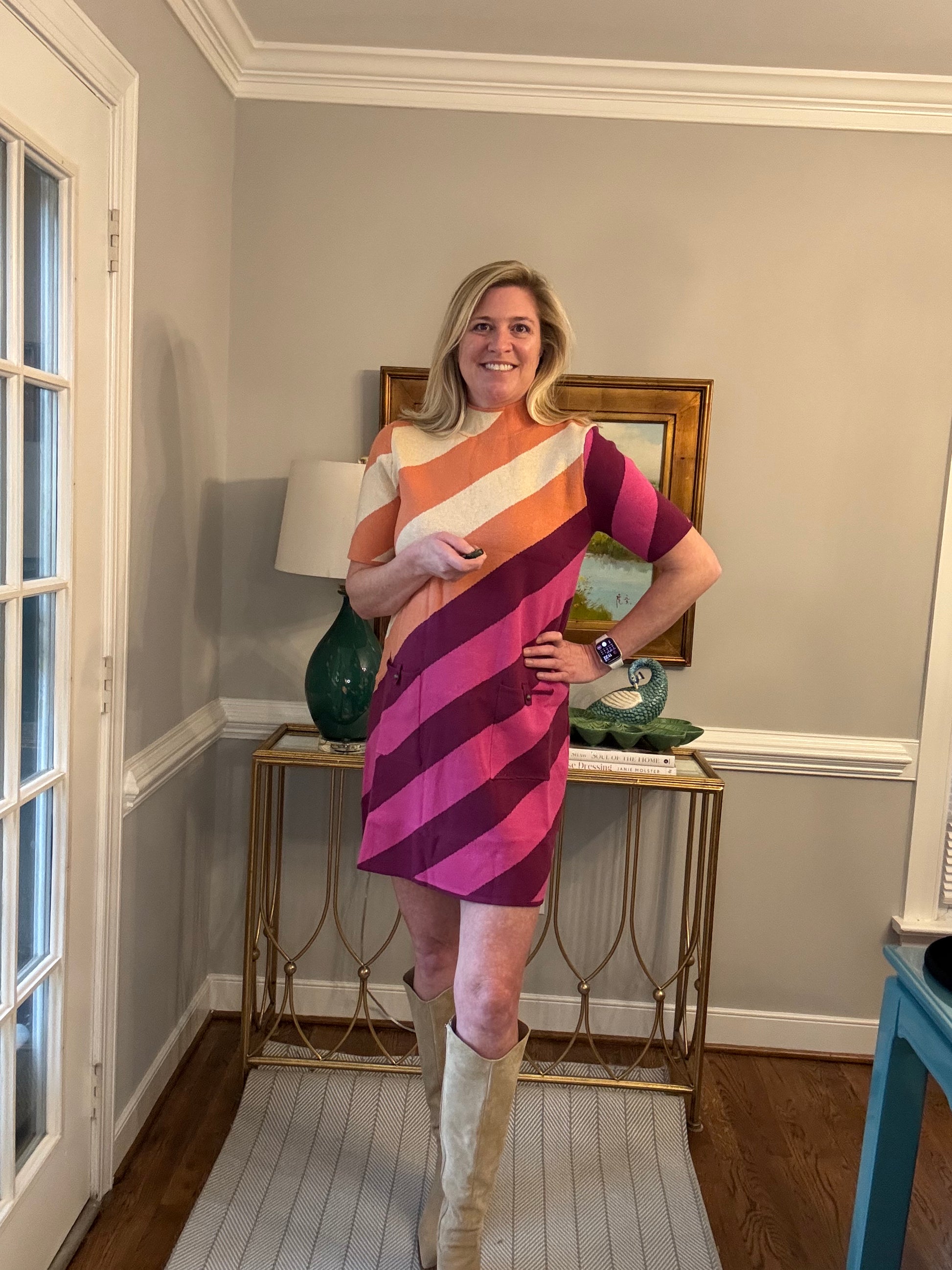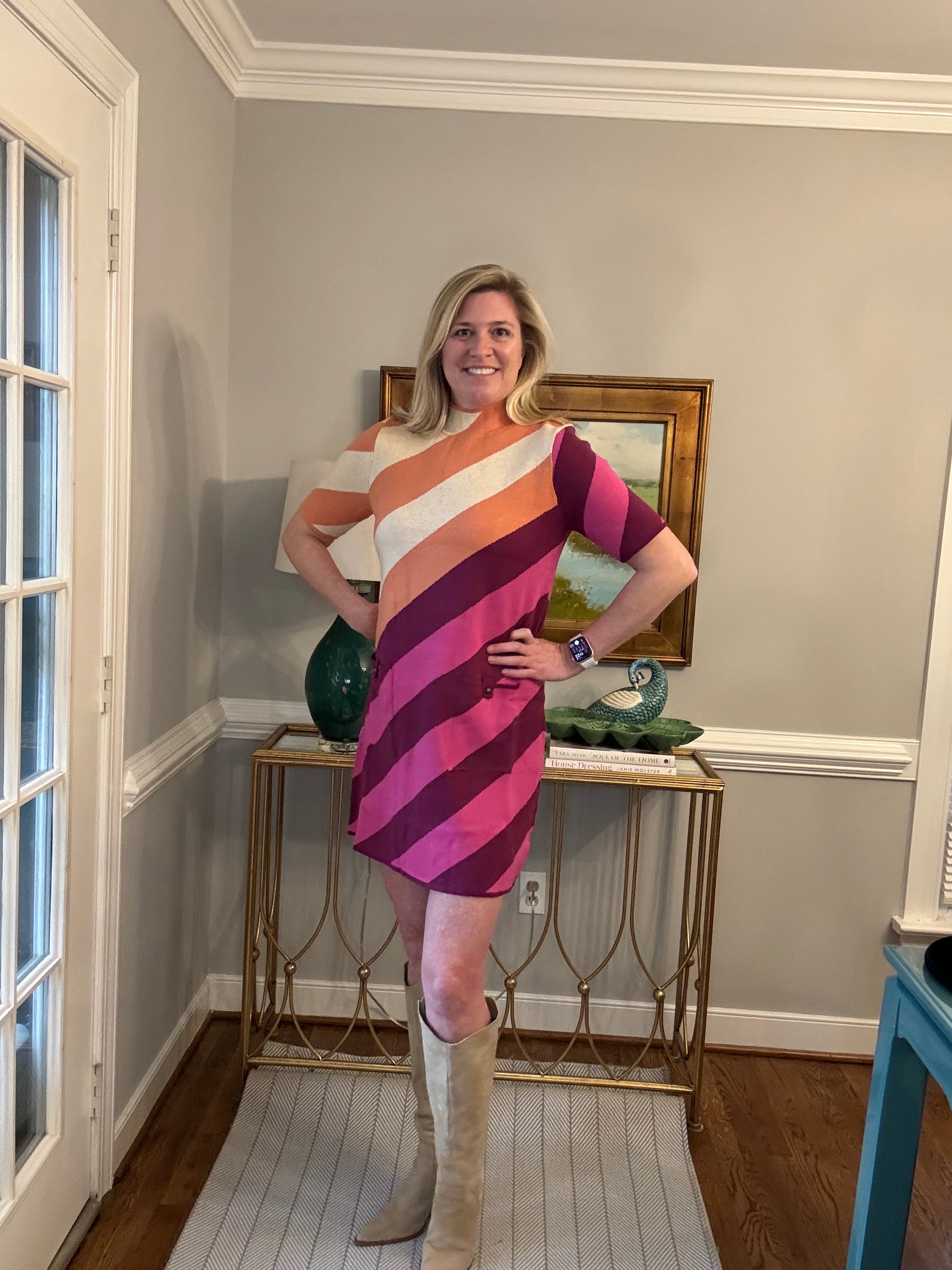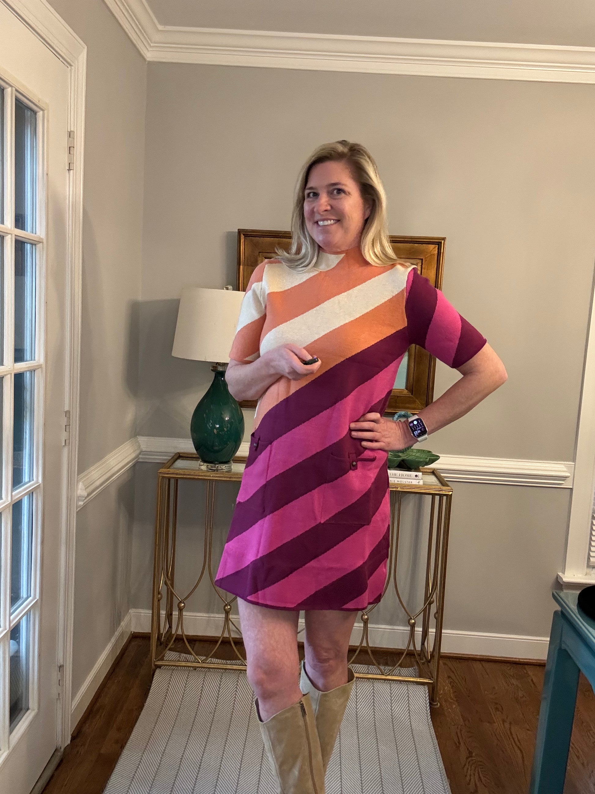 The Tyler Stripe Sweater Dress showcases a striking diagonal stripe pattern in warm pinks, reds, and orange tones, creating a vibrant yet sophisticated look. Its smocked neckline offers a flattering, comfortable fit while adding subtle texture. Perfect for transitional seasons, this dress combines cozy sweater material with elegant design details, making it an ideal choice for both casual and refined occasions.