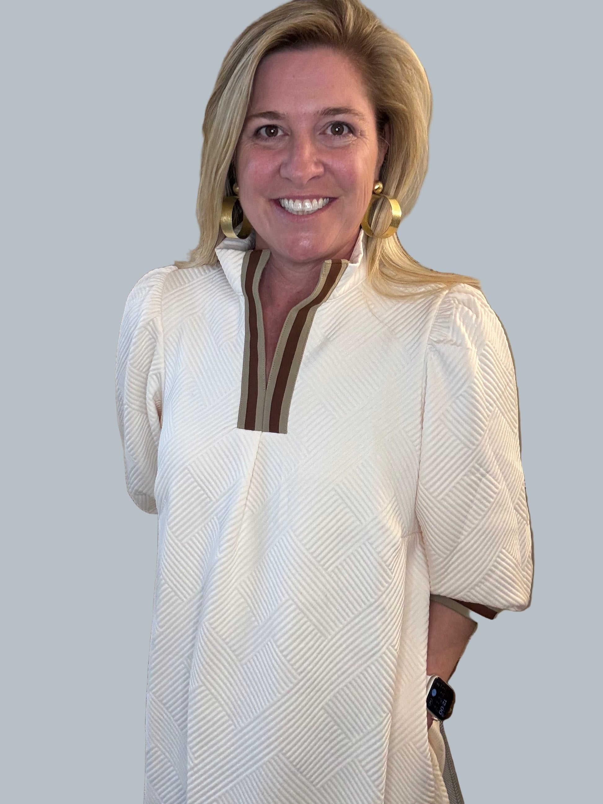 The Effie Cream Herringbone Dress features a timeless cream herringbone pattern accented by brown stripe detailing on the sleeves and neckline. Its distinctive pop collar adds a refined, structured touch to the design. Expertly tailored for both comfort and style, this dress offers a sophisticated blend of classic textures and contemporary accents, making it an ideal choice for polished, professional looks.